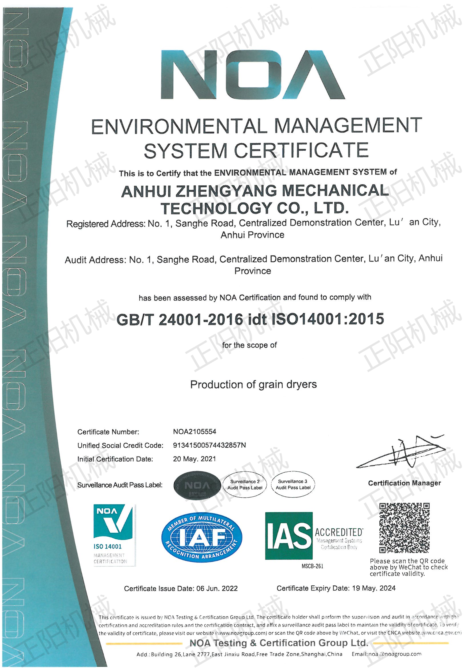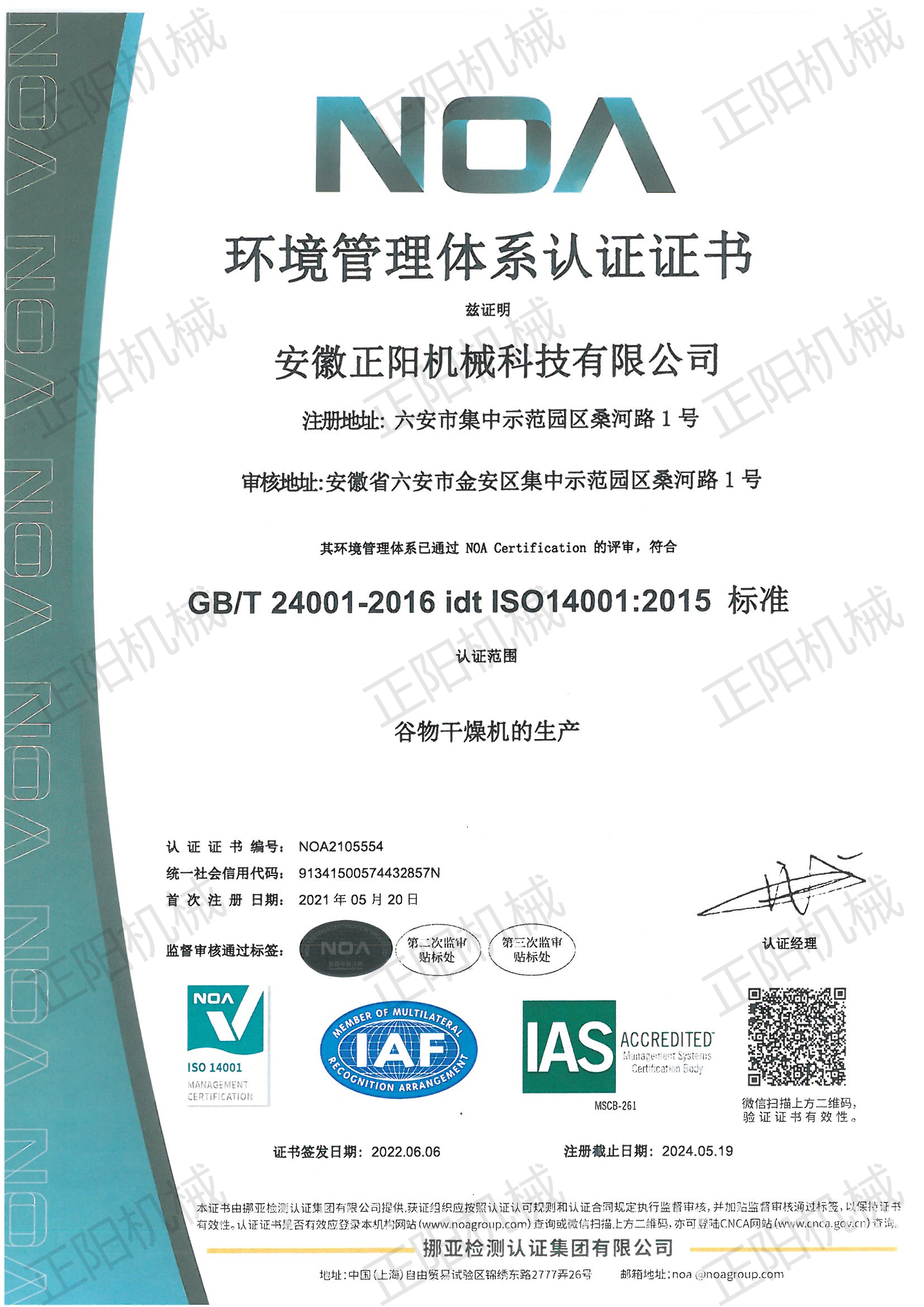 環(huán)境管理體系認證證書