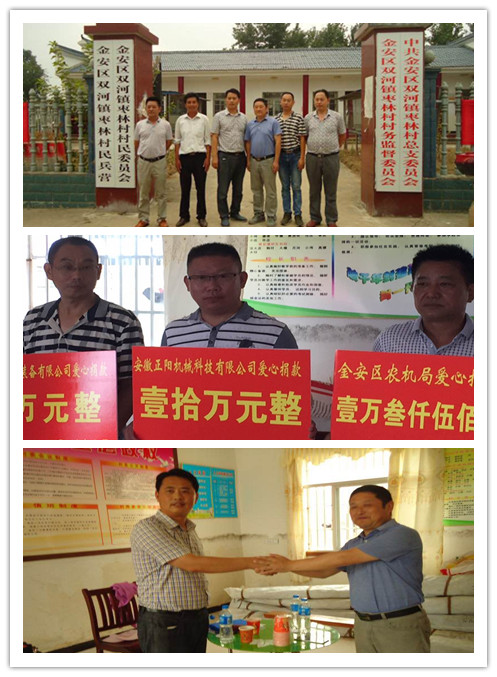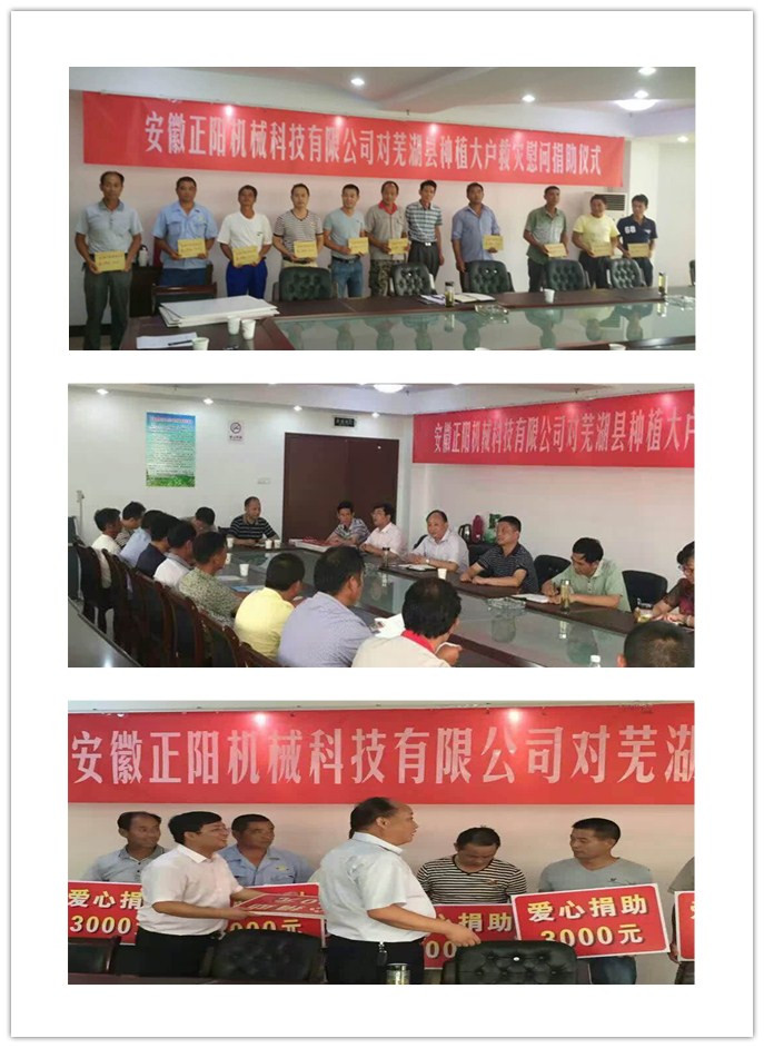 同時我公司針對今年長江中下游、江淮區(qū)域發(fā)生的嚴(yán)重的洪澇災(zāi)害勇于擔(dān)當(dāng),注重快速發(fā)展自身的同時更高度重視企業(yè)社會責(zé)任,本著以回報(bào)社會為己任;企業(yè)利潤來之于民、用之于民;義利兼顧的宗旨,安徽正陽機(jī)械科技有限公司總經(jīng)理張為法于2016713日下午前往“正陽”糧食烘干機(jī)主銷區(qū)域安徽蕪湖、六安、湖北孝感等受災(zāi)嚴(yán)重地區(qū)捐贈現(xiàn)金數(shù)十萬元,幫助災(zāi)區(qū)人民萬眾一心共抗洪災(zāi),盡快恢復(fù)生產(chǎn),讓受災(zāi)群眾真實(shí)感受到黨和政府的溫暖、民營企業(yè)家的責(zé)任,公司以正能量品牌的形象和風(fēng)范履行了自身應(yīng)盡的社會責(zé)任。